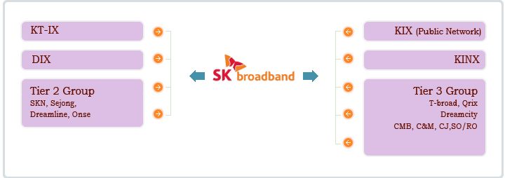 SK IDC의 인터넷망은 국내 Tier1 사업자로서, 주요 IX, ISP사업자 및 통신사업자들과 국내 최고수준의 연동망을 구축하여 운영입니다.